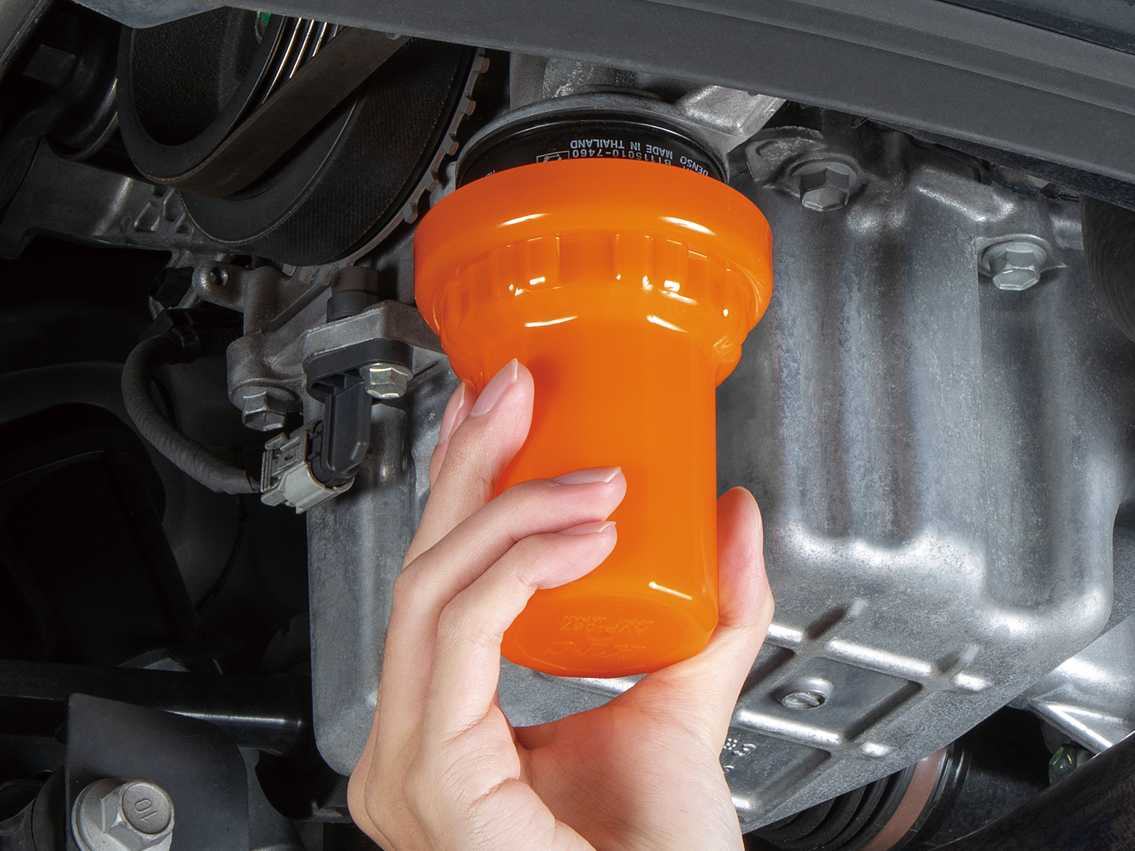 作業箇所に干渉することなくショートタイプのオイルフィルタの取り外しができ、フィルタ接続部からのオイル漏れと手の汚れを防いで、効率的な作業が行えます。